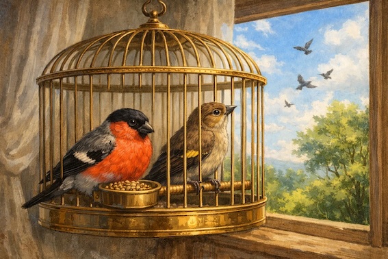 Молодий птах (підліток): символ вільнолюбного духу. Він знає ціну справжньої свободи, бо бачив її на власні очі, тому золота клітка для нього — це лише в’язниця, а не дім.