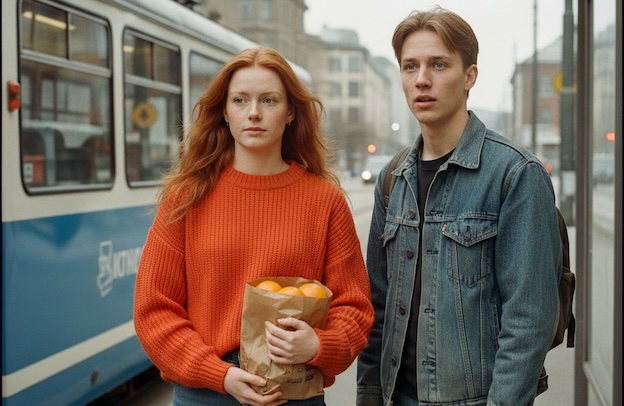 Юнак не наважувався заговорити й лише стежив за нею. Коли трамвай різко смикнувся, йому здалося, що дівчина падає і він хотів її вхопити, але натомість лише незграбно вибив пакет з її рук, і десятки плодів розкотилися під ногами пасажирів. Дівчина дивилася на нього з таким розпачем, ніби кожна помаранча була для неї незамінною. Паленіючи від сорому, хлопець збирав фрукти з брудної підлоги. Дівчина сердито назвала його «розтелепою». На наступній зупинці вона забрала в нього лише одну помаранчу і вистрибнула з трамвая.